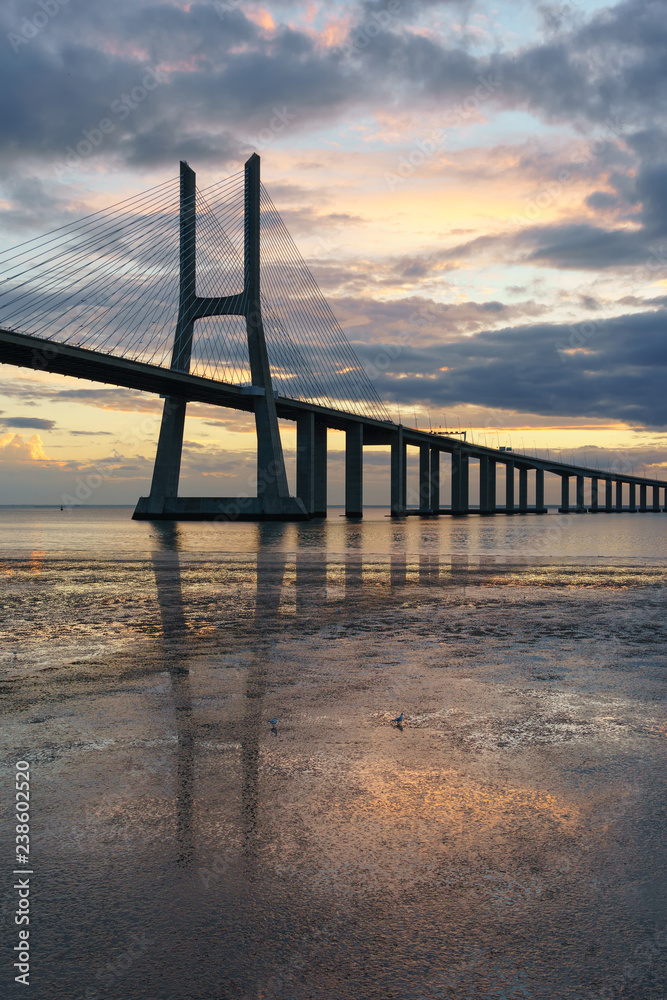 Lisbon landmark. Vasco da Gama Bridge landscape at sunrise. Lisbon is an amazing tourist destination because its light, its monuments.