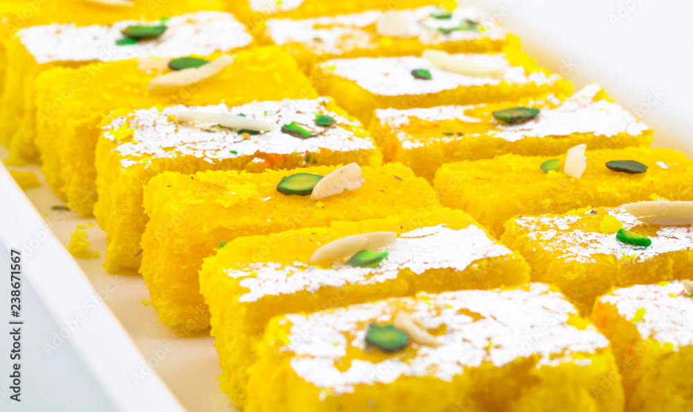Indian Popular Sweet Food Khopara Pak or Coconut Burfi made up of Coconut, Milk And Sugar Isolated on White Background