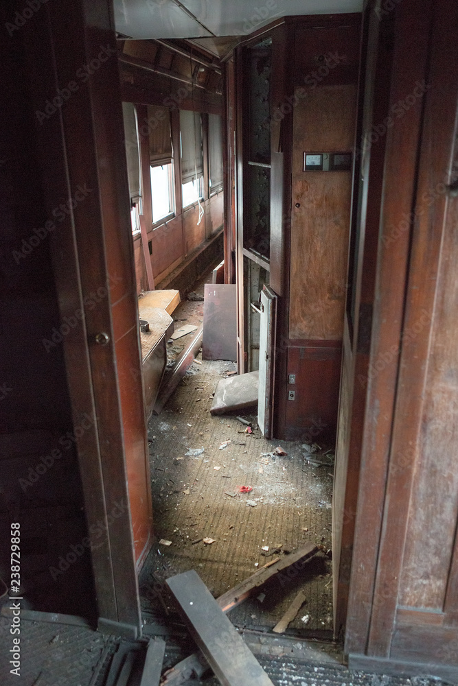 Inside of abandoned orient express in Malaszewice, Poland. Train is getting damaged stuck for 10 years.