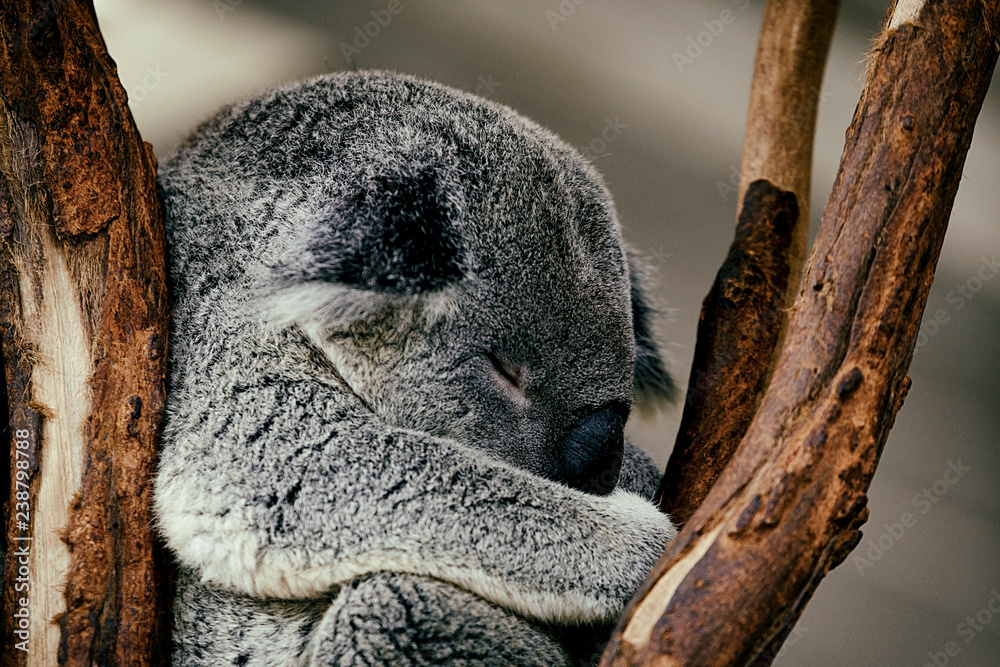 koala sleepy in the trunk of a eucalyptus, brisbane