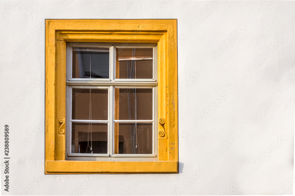 Fenster eines restaurierten Fachwerkhauses teils verputzt mit Sandsteinumrahmnung, verziert und gelber Fasche