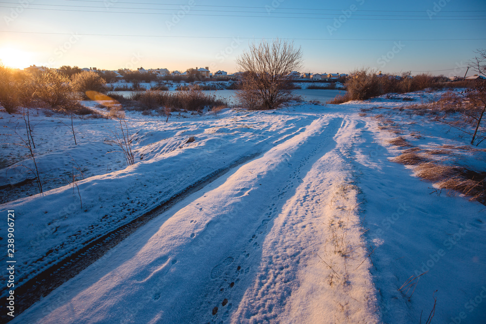 Winter sunny morning landscape with a country road
