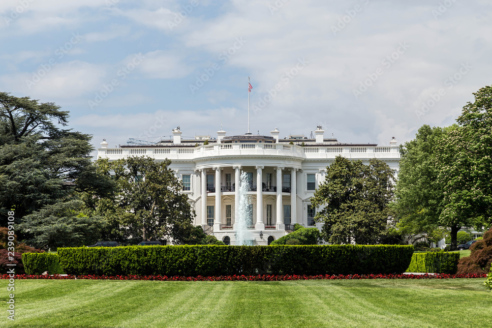 The White House in Washington DC from the South Lawn on a beautiful day.