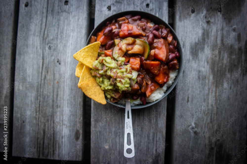 Vegan bean chili with guacamole, tortilla chips and rice on camp stove