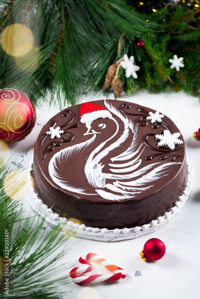 Christmas or New Year eve bird milk chocolate cake for midnight family celebration dinner dessert table in Christmas setup decoration, green fir branches with colorful baubles on white background