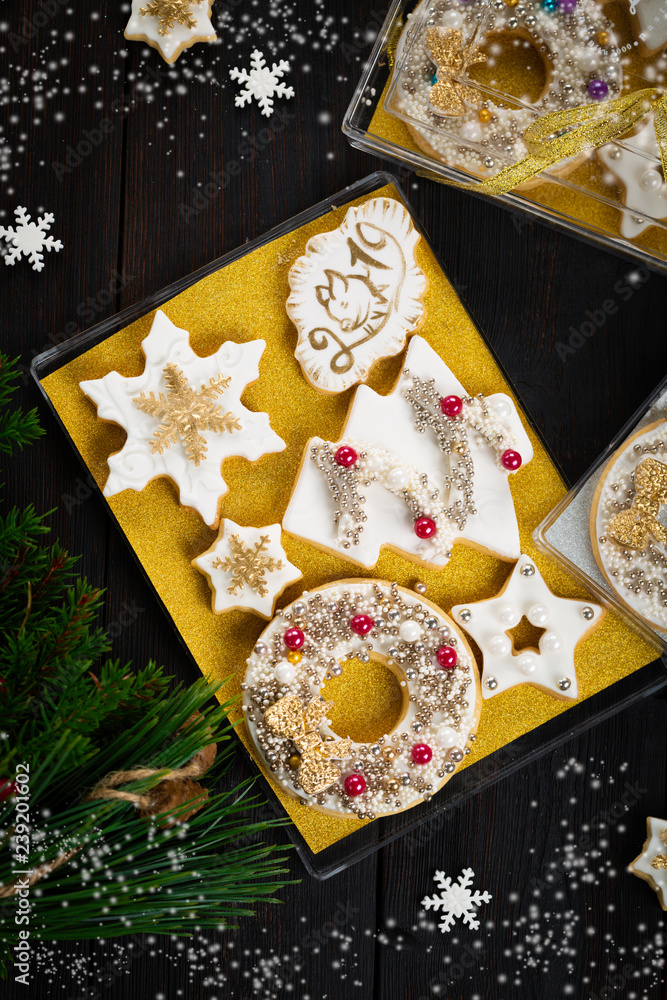 Gingerbread cookies gift set box with white icing, silver and golden sprinkles, snowflake, Christmas tree, stars and pig face on biscuits, dark wooden background, homemade sweets present, copy space