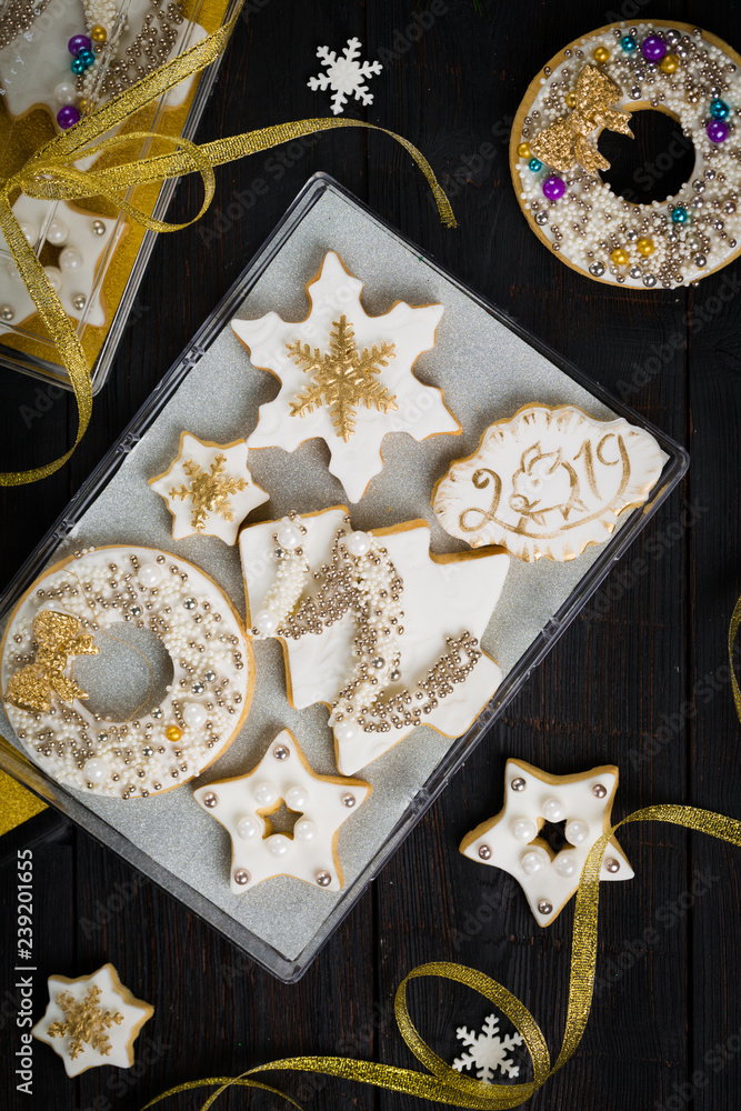 Gingerbread cookies gift set box with white icing, silver and golden sprinkles, snowflake, Christmas tree, stars and pig face on biscuits, dark wooden background, homemade sweets present, copy space