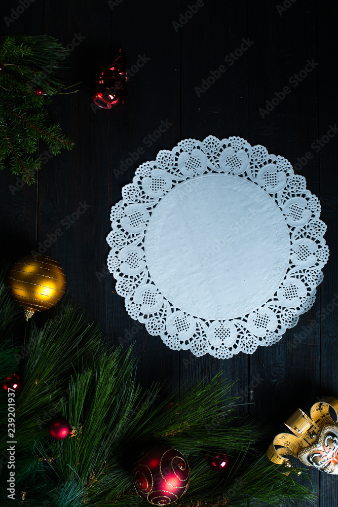 Christmas frame background with fir tree green branches, greeting card with decoration in red and golden colors on dark brown wooden board, copy space for text