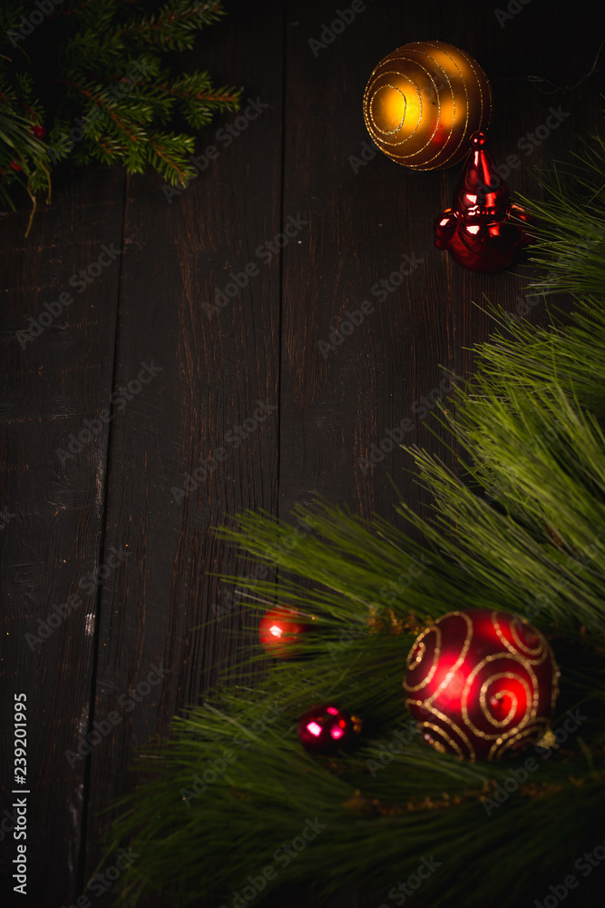 Christmas frame background with fir tree green branches, greeting card with decoration in red and golden colors on dark brown wooden board, copy space for text
