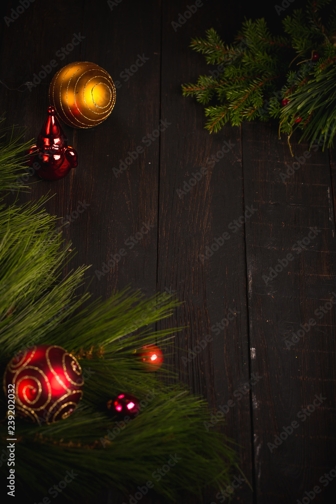 Christmas frame background with fir tree green branches, greeting card with decoration in red and golden colors on dark brown wooden board, copy space for text