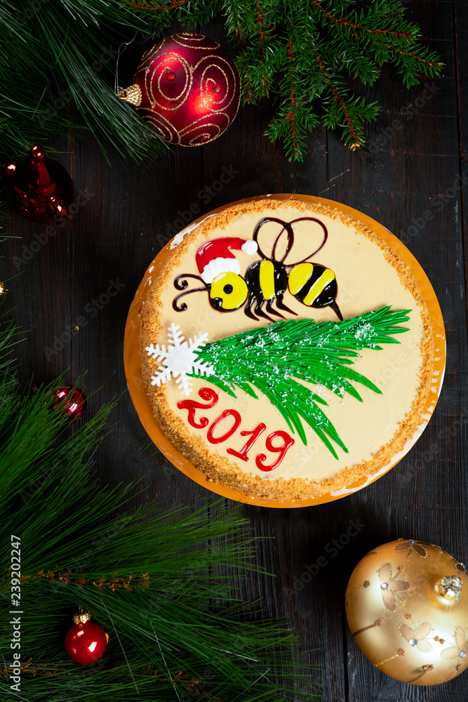 Traditional honey cake for Christmas in New Year festive arrangement, wooden dark background with green fir tree branches and baubles