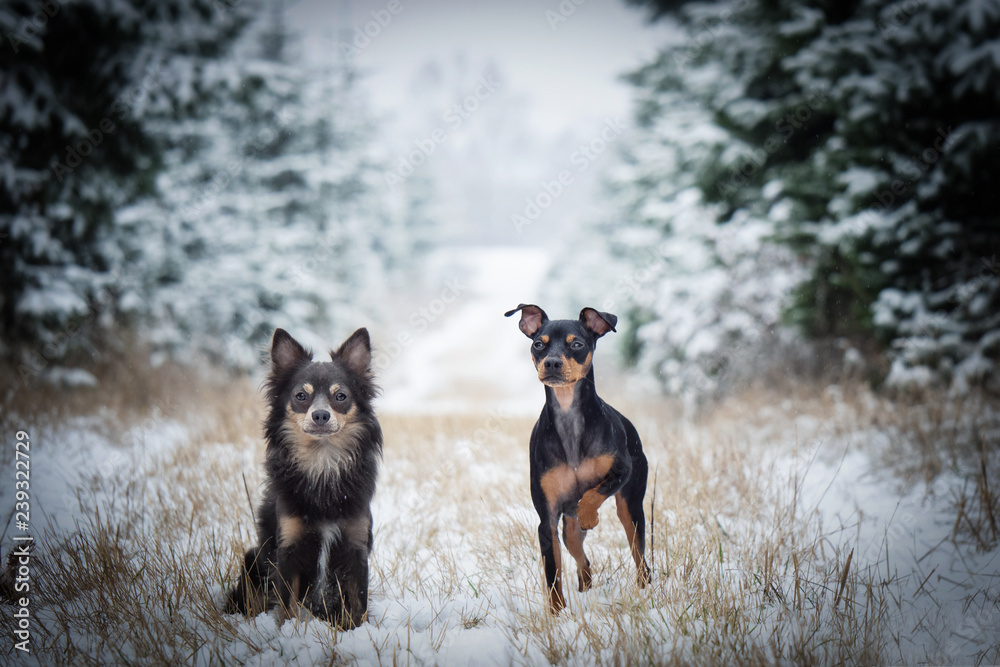 Hund Chihuahua zwergpinscher im schnee in der natur im feld mit bäumen und himmel im hintergrund