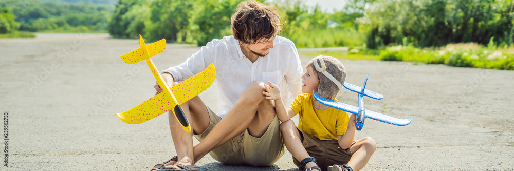 Happy father and son playing with toy airplane against old runway background. Traveling with kids concept BANNER, LONG FORMAT