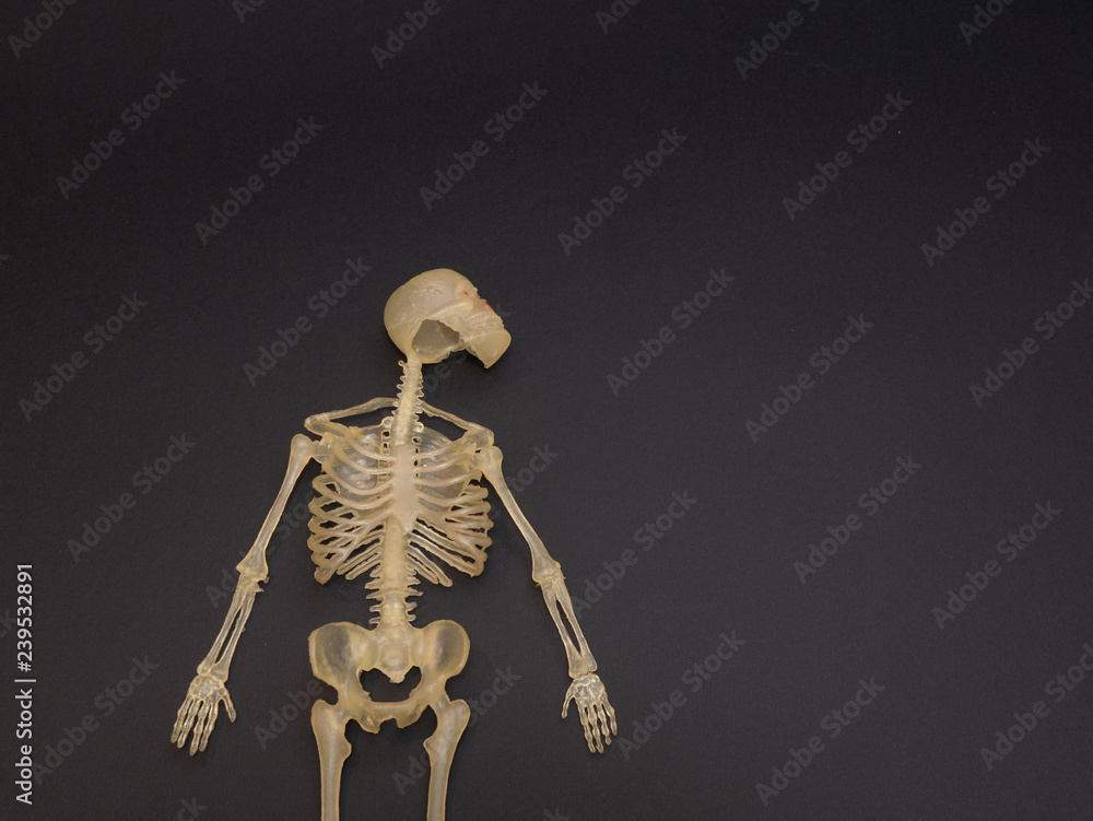 human body skeleton toy on dark black background with copy space on the right for copy space