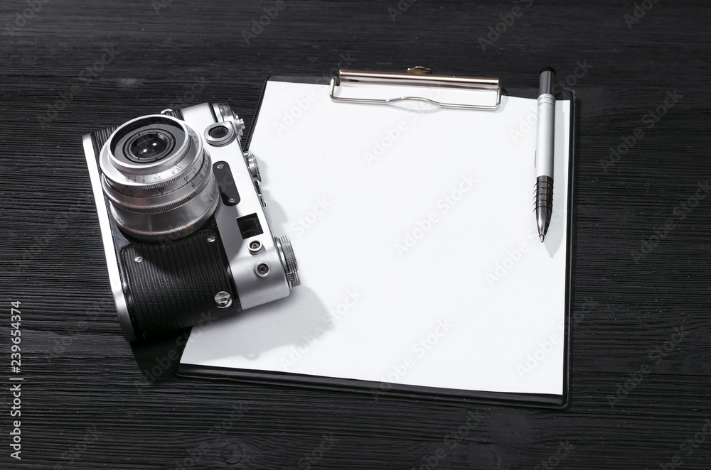 Shot list mockup. Photo session contract template. Vintage film photo camera and blank paper page on black wooden table background. Top view photo.