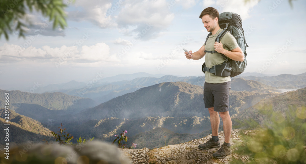 Wanderer vor weiter Landschaft schaut aufs Smartphone