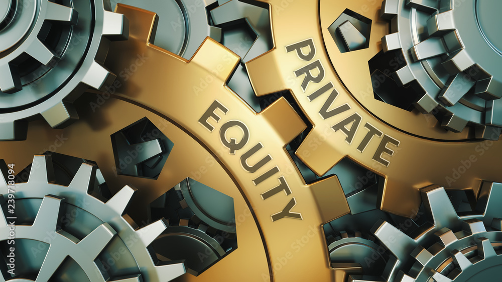 PRIVATE EQUITY concept. Gold and silver gear wheel background illustration. 3d render.