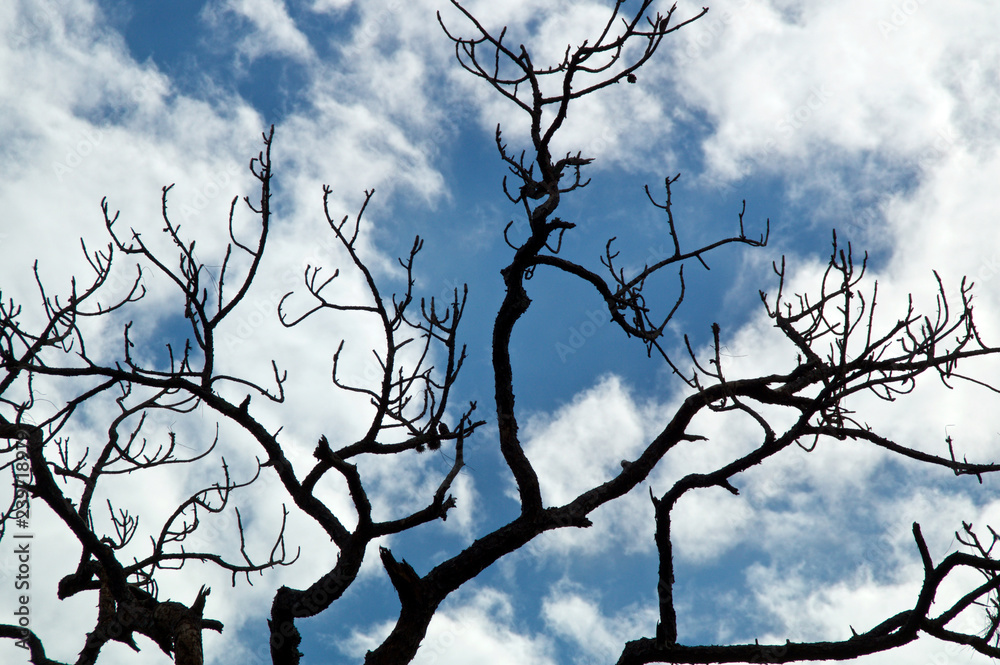Looking up at the top of a dead Slash Pine Tree, showing gnarly, crooked, spooky looking branches against a cloud filled sky.