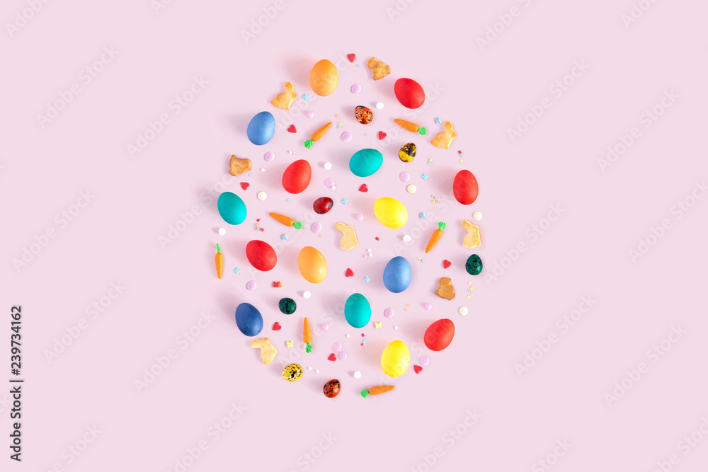 Top view and flat lay of arrangement decoration Happy Easter, holiday background concept. Colorful bunny cookies, eggs and topping ornament design as big egg on pink pastel desk.