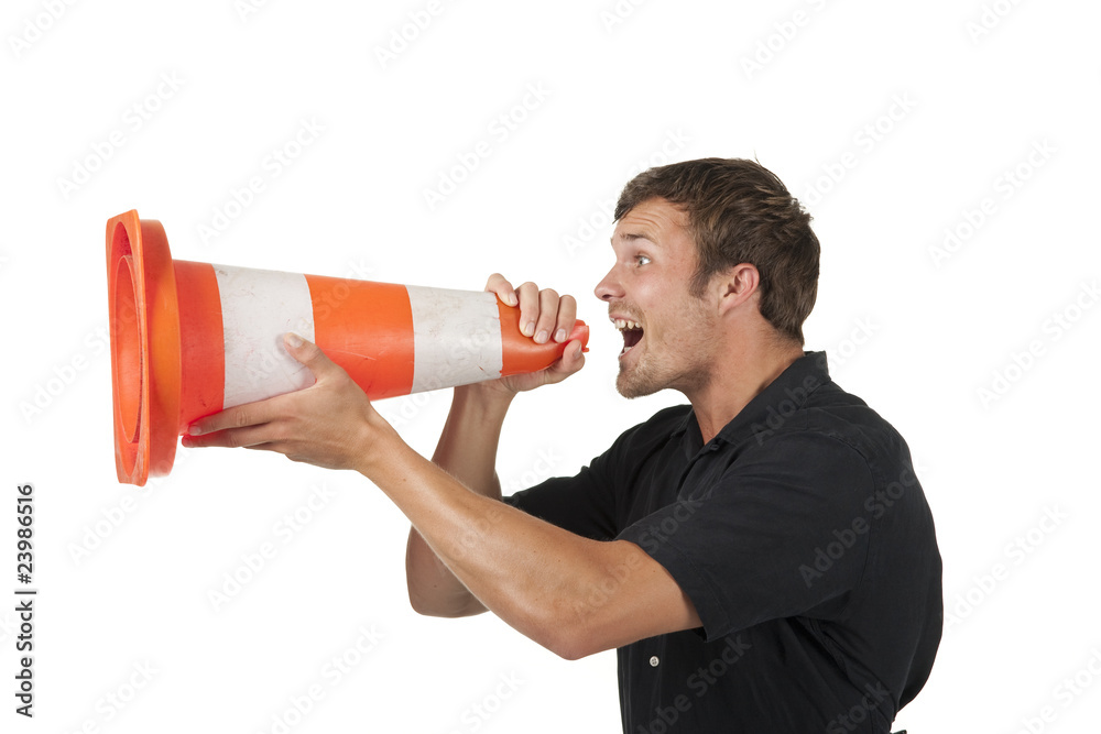 Ein junger mann benutzt Pylone als Megafor