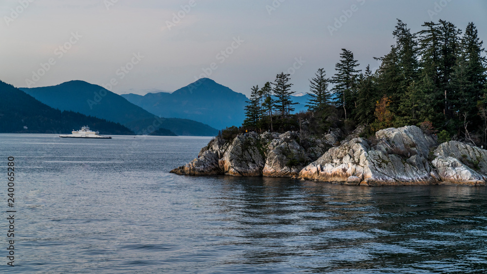 Sunset over Whyte Cliff, withs ferry leaving the terminal in the background. West Vancouver, beautiful British Columbia, Canada.