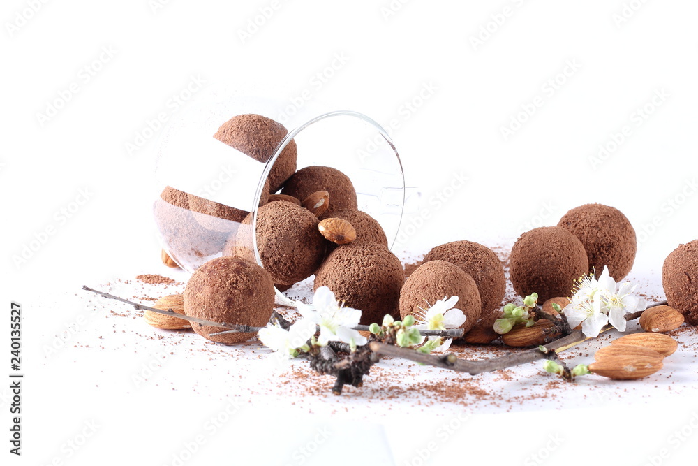 конфеты ручной работы в какао лежат на белом фоне