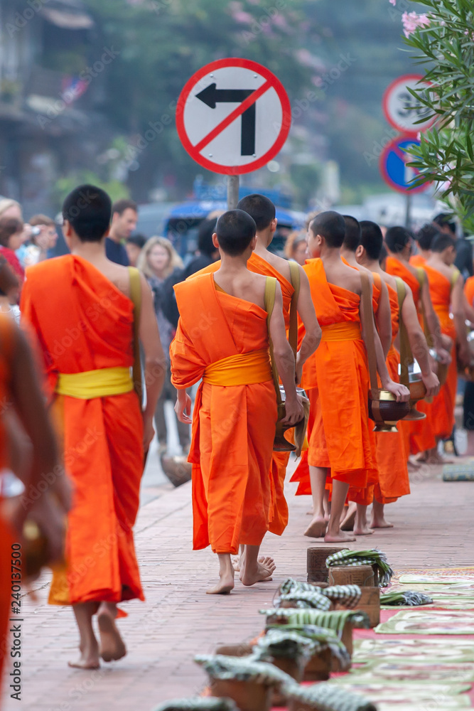 Buddhist novice monks with buddhist alms giving ceremony at Luang Prabang.