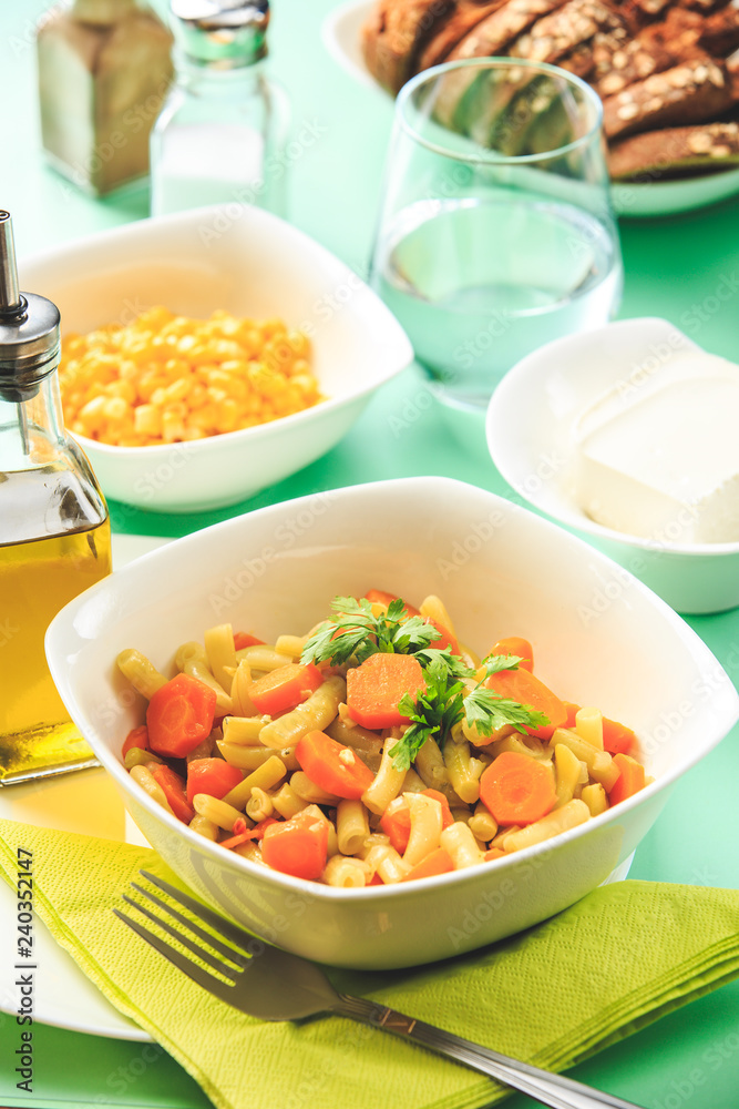 Served plate of mixed vegetarian lunch for one person. Plate of cooked green beans and carrots. Next to homemade bread and cooked sweet corn.