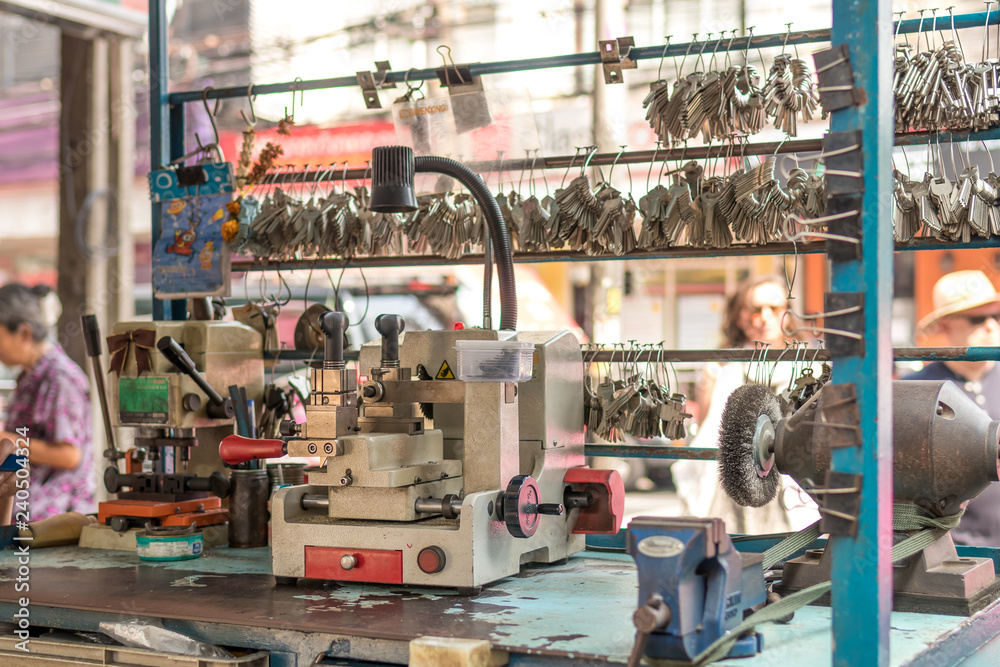 Machine production of duplicate metal keys for doors on the street of Bangkok.