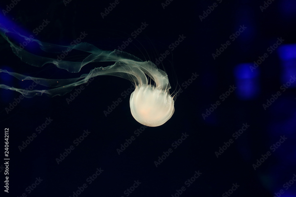 Beautiful jellyfish, medusa in the neon light with the fishes. Underwater life in ocean jellyfish. exciting and cosmic sight