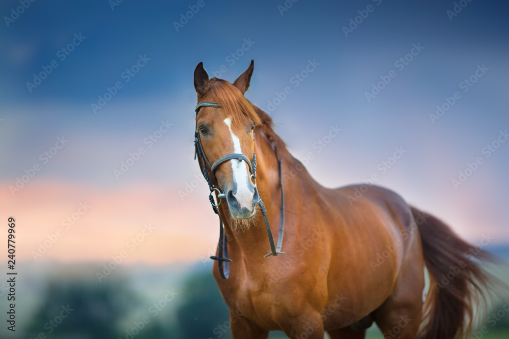 Red horse portrait in bridle against dramatic rain sky