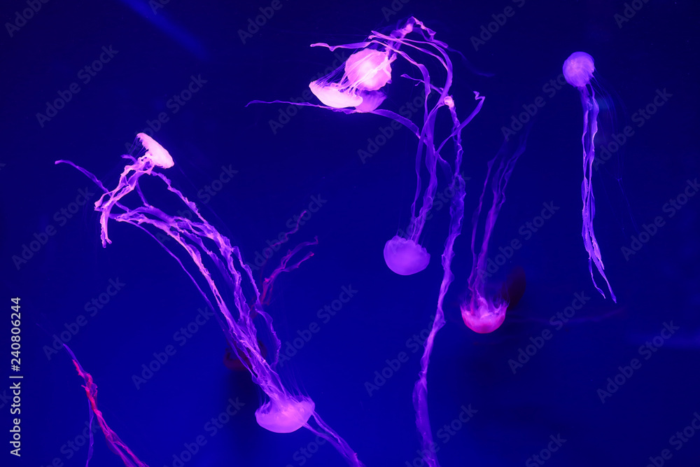 Beautiful jellyfish, medusa in the neon light with the fishes. Underwater life in ocean jellyfish. exciting and cosmic sight
