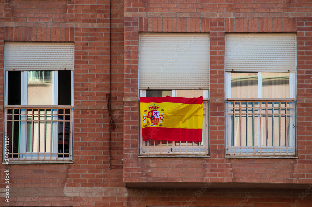 Flag of Spain hanging on the balcony of a house as a symbol of support for Spanish nationalism in the face of Catalan independence