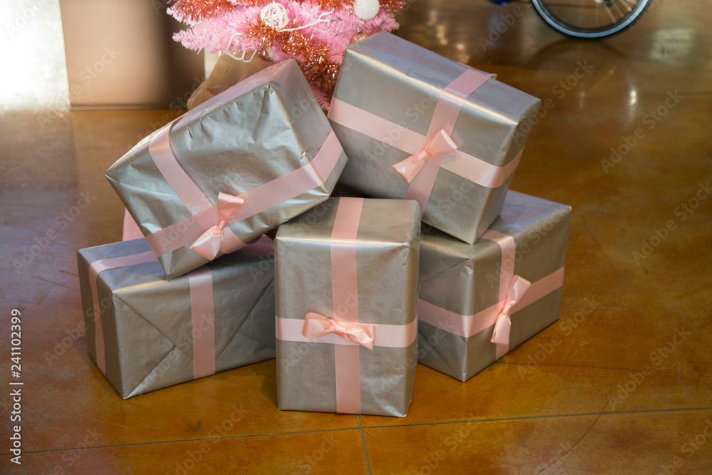 horizontal image with detail of five christmas presents decorated with pink ribbon under a pink christmas tree