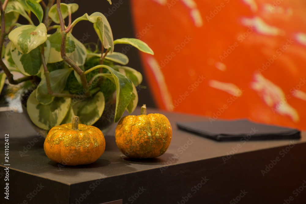 horizontal image with detail of two small orange pumpkins used as decoration in a restaurant, photographed in a restaurant near a plant