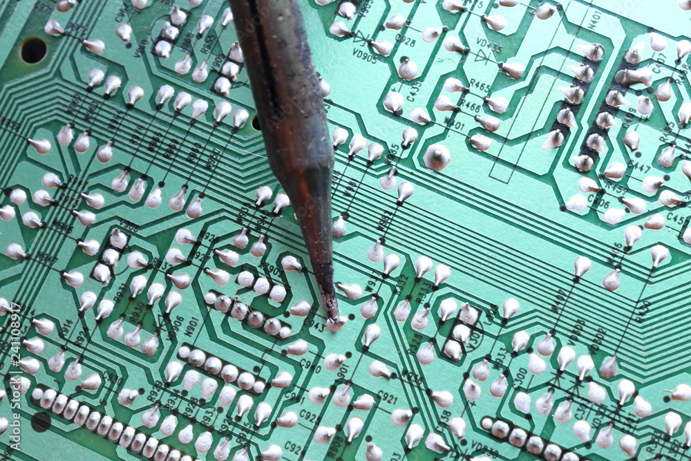 A soldering iron plated tip soldering a through hole component on its track on a green printed circuit board