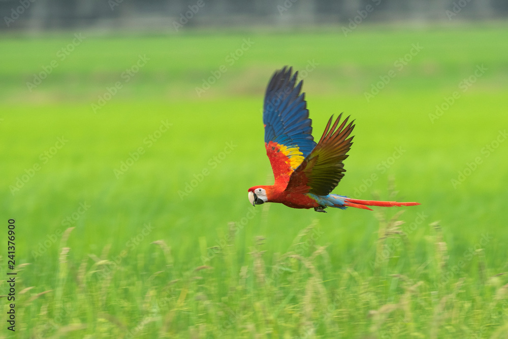 Scarlet macaw flying on green background