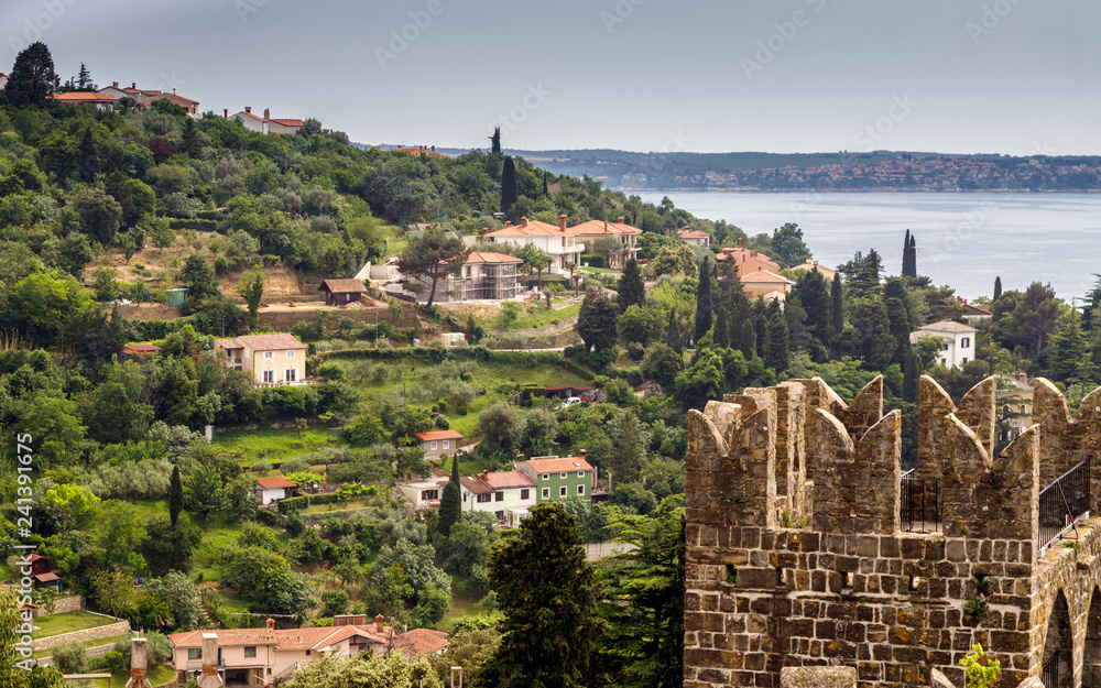 Panoramic view from the fortress in Piran, Slovenia. The old town medieval fortified walls in the foreground. Holidays in Slovenia.