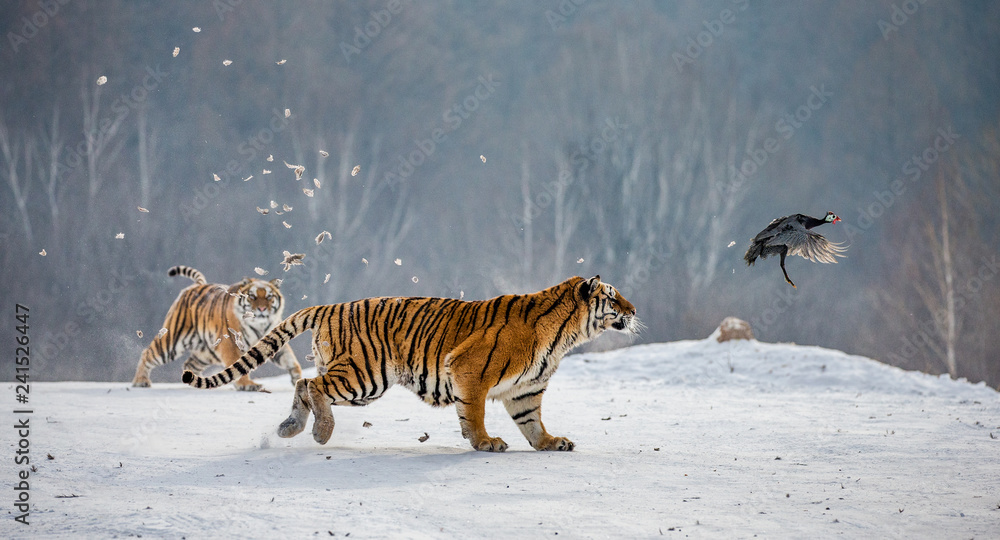 Siberian tigers in a snowy glade catch their prey. Very dynamic shot. China. Harbin. Mudanjiang province. Hengdaohezi park. Siberian Tiger Park. Winter. Hard frost. (Panthera tgris altaica)