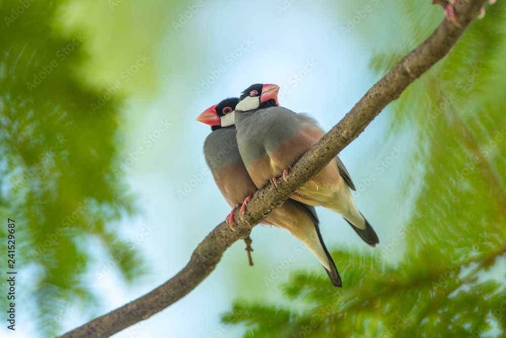 Beautiful bird, Java sparrow or Java finch perching on a branch