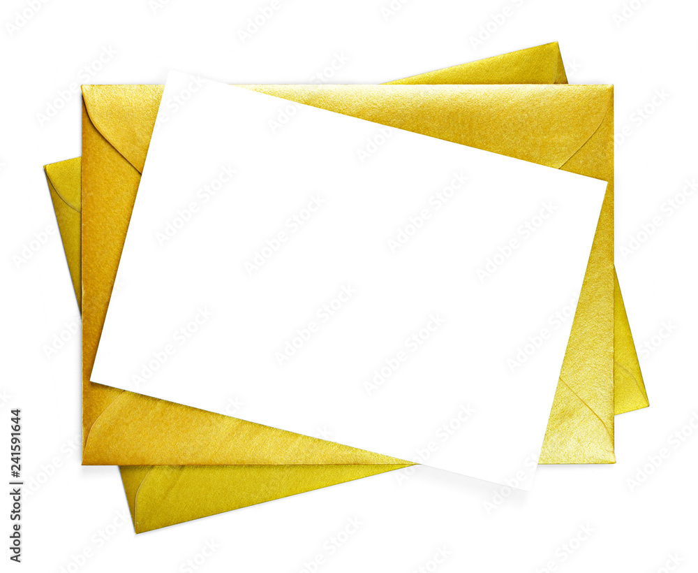 Golden envelope and white card with copy space, isolated on white background. Shiny gold envelope, greeting card or invitation mailing.