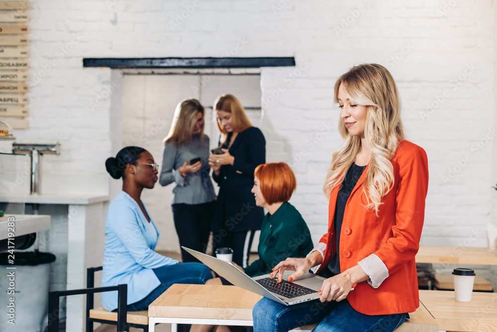 Attractive female manager with long blond hair dressed in red coat, using smartphone in well-lit white office interior