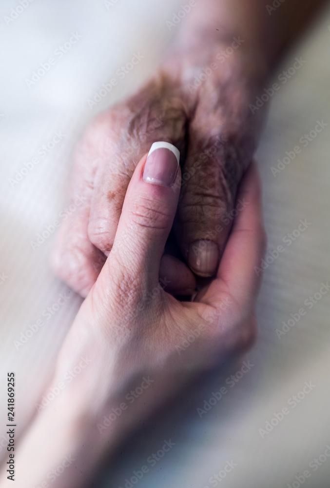 Helping hand. The hand of a young woman carefully supports the wrinkled hand of an old woman
