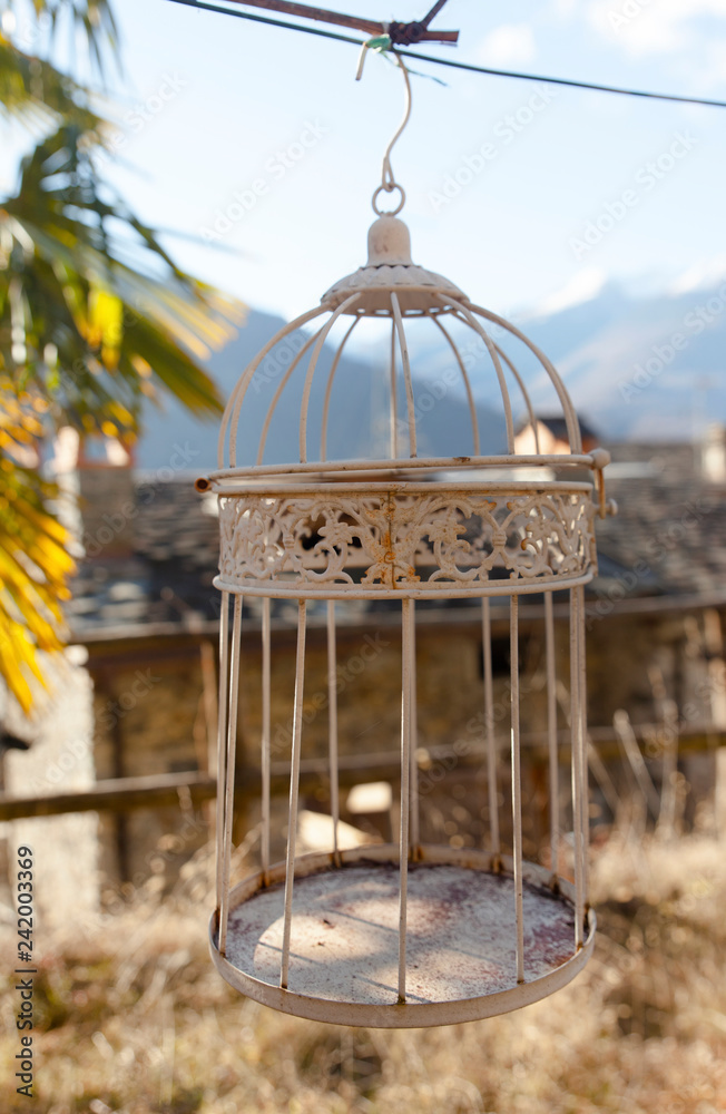 una vecchia gabbia per uccelli vuota appesa a un ramo di un albero nel cortile in un vecchio borgo