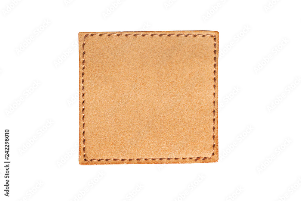 Brown stitched leather seam frame label tag isolated on white. Empty copy space fashion background.