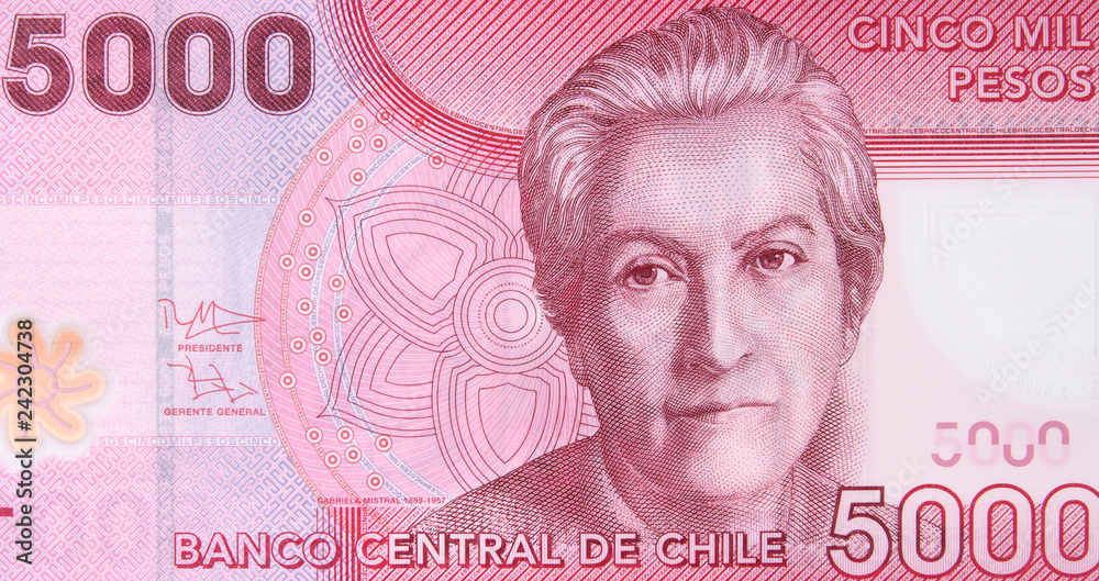 Chilean 5000 peso (2009) banknote. Chile money currency close up. Chile economy.