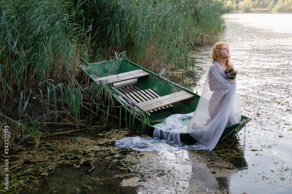 schöne junge Frau, Braut, Lady of Shalott, steht sehnsüchtig verlassen mit Blumenstrauß auf einem Boot und wartet voller Todessehnsucht auf den verflossenen Liebsten