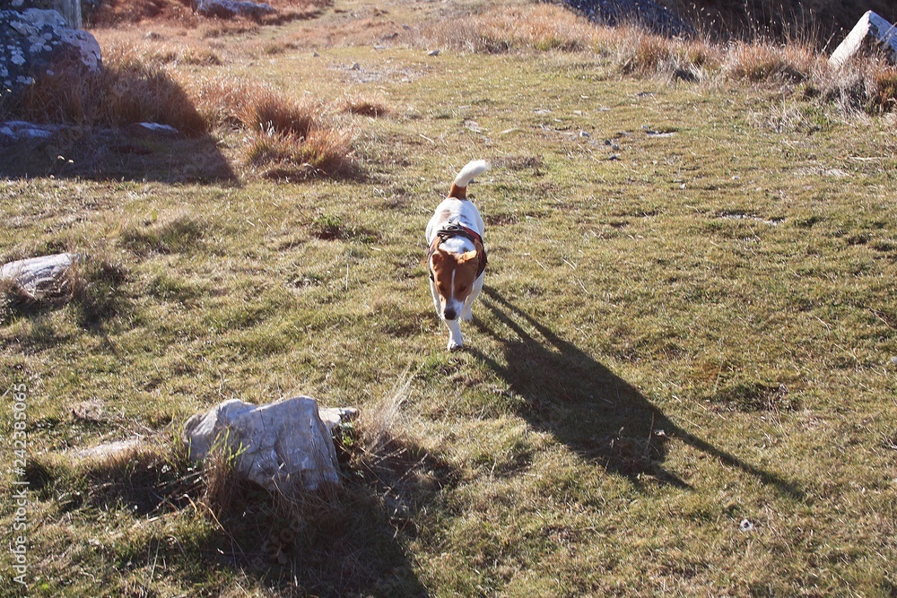 brown and white russel jack puppy left free to run, have fun and play in the nature on the mountains.