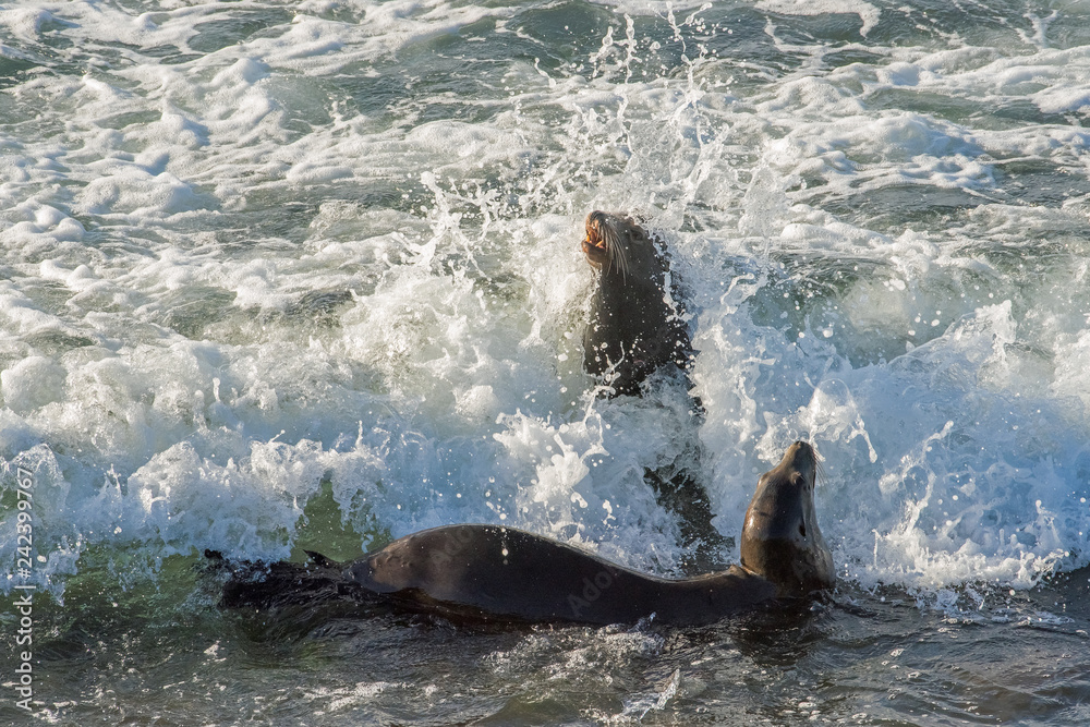 California Sea Lions Caught in Incoming Waves while Playing in the Surf