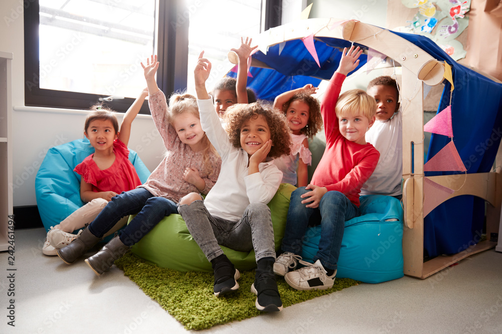 A multi-ethnic group of infant school children sitting on bean bags in a comfortable corner of the classroom, raising their hands to answer a question, low angle, close up